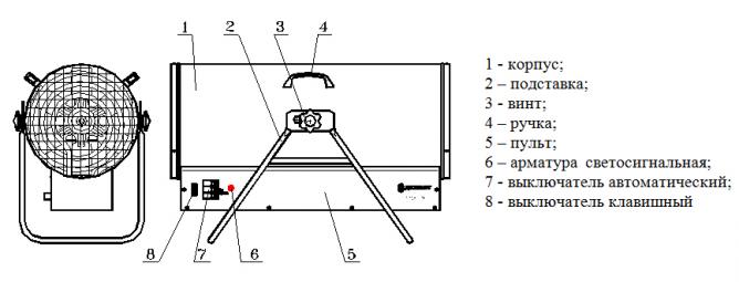 Тепловая пушка состоит из корпуса в виде трубы, внутри которого установлены трубчатые электронагреватели (ТЭН) и двигатель с вентилятором, а также пульта управления. Во время работы воздушный поток от вентилятора, проходя через корпус электрической пушки, огибает тэны и нагревается до определенной температуры.