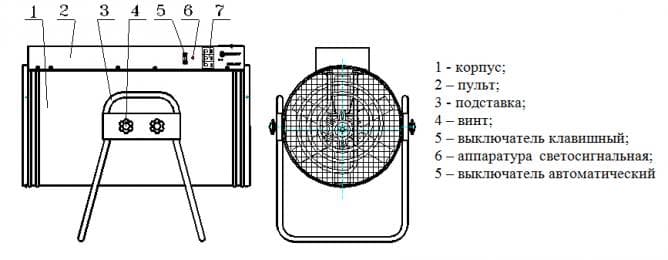 Тепловая пушка состоит из корпуса в виде трубы, внутри которого установлены трубчатые электронагреватели (ТЭН) и двигатель с вентилятором, а также пульта управления. Во время работы воздушный поток от вентилятора, проходя через корпус электрической пушки, огибает тэны и нагревается до определенной температуры.