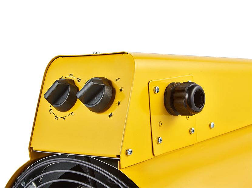 В цилиндрическом корпусе пушки нагревательные элементы особой формы способствуют созданию более эффективного направленного воздушного потока. Тип нагревательного элемента - трубчатый электронагреватель (ТЭН). В пушке предусмотрено два режима мощности и режим вентиляции. Обогреватель питается от сети 400В и имеет кабельный ввод на корпусе, что обеспечивает простоту и надежность подключения.