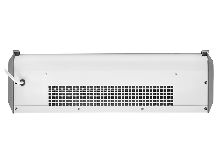 Передняя панель без перфорации блокирует распространение шума от вентиляционных колес, направляя его в потолок, а не в проходящих людей, что делает завесу значительно тише аналогов в классическом корпусе.
